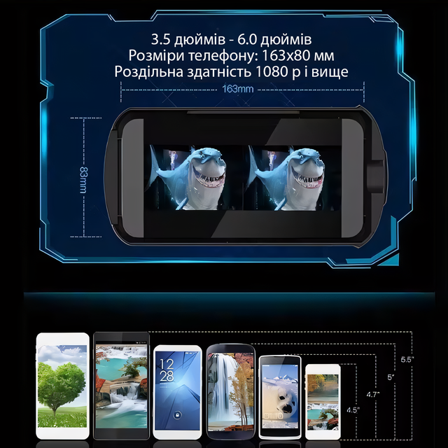 - Сумісність із більшістю пристроїв: Шолом підтримує більшість смартфонів і планшетів з екранами розміром до 16х8,2х1 см, що робить його універсальним і доступним для багатьох користувачів;
