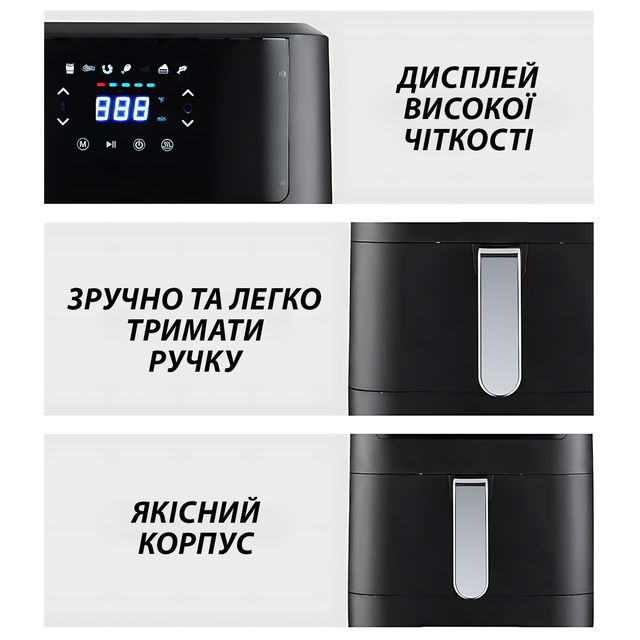 - ✅ 8 автоматичних програм — оптимальні параметри для картоплі фрі, курки, риби, овочів та інших страв.