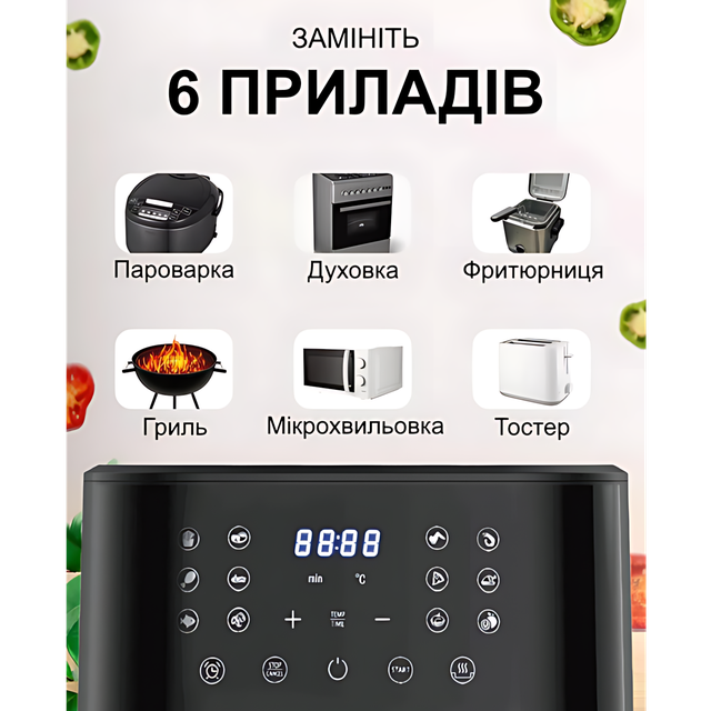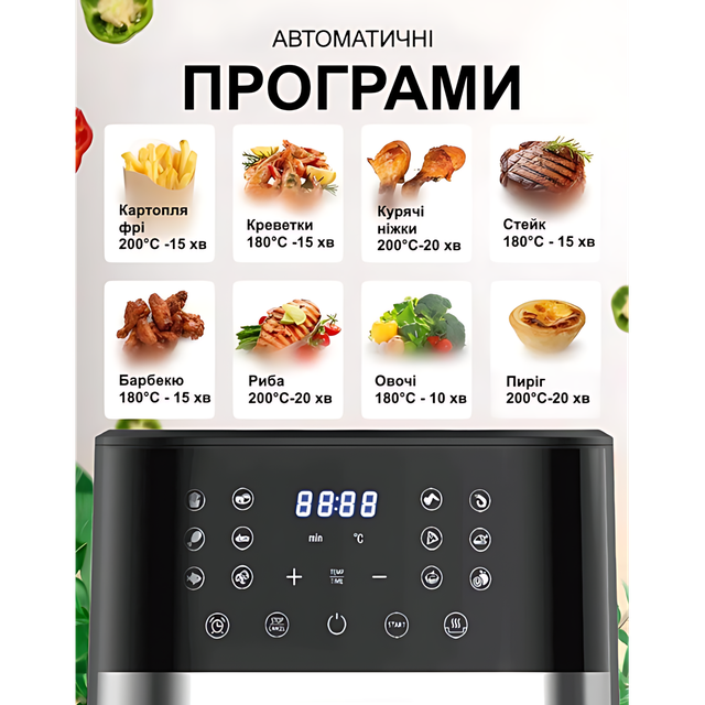 - ✅ 8 автоматичних програм — для приготування картоплі фрі, стейка, курки, риби, овочів та інших страв.