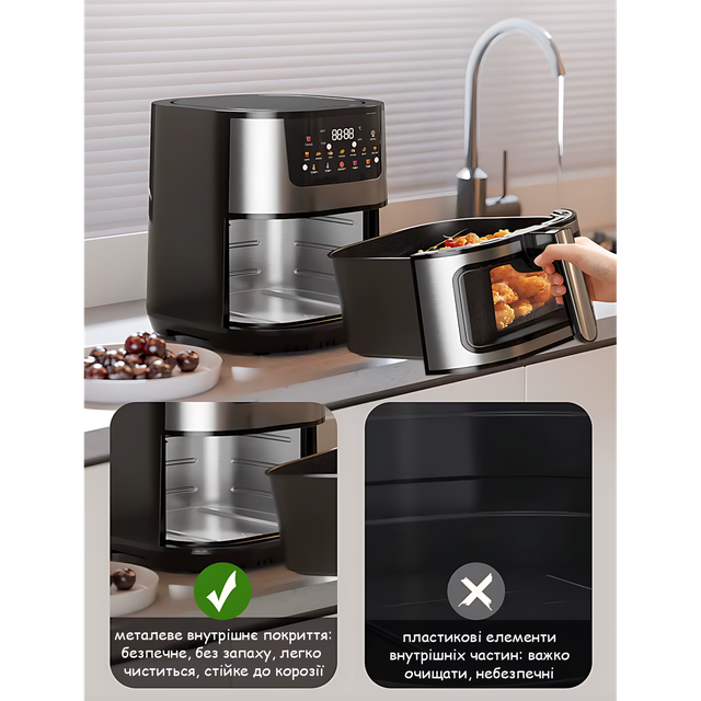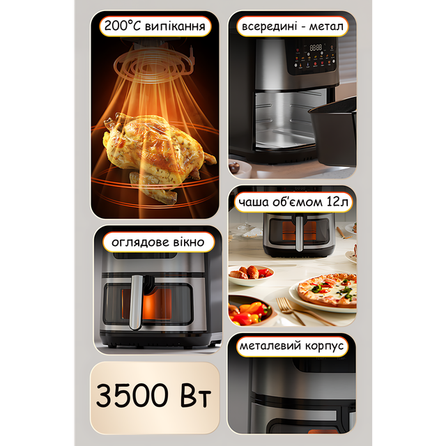 - ✨ Потужність 3500 Вт — швидко розігрівається й готує удвічі швидше, ніж духовка.