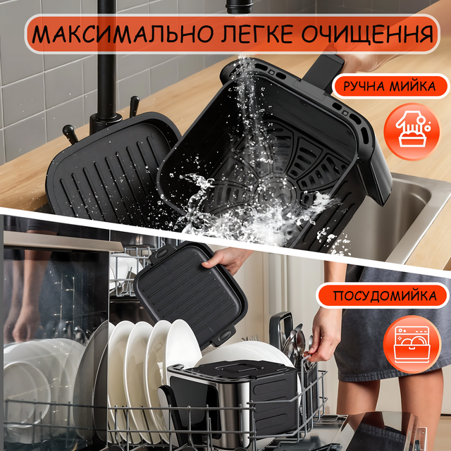 Сенсорне керування просте та надійне: вибираєш температуру, час — і робиш свої справи. Аерофритюрниця не вимагає складного догляду: знімні елементи легко очищаються після готування.