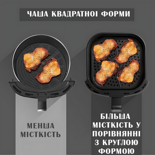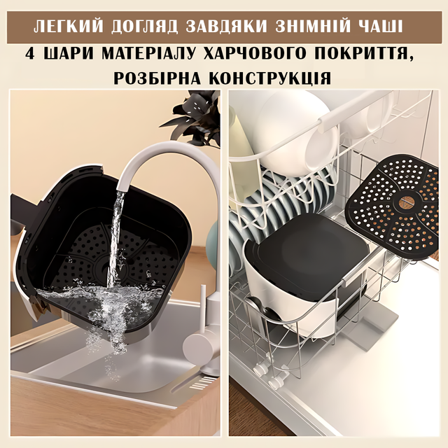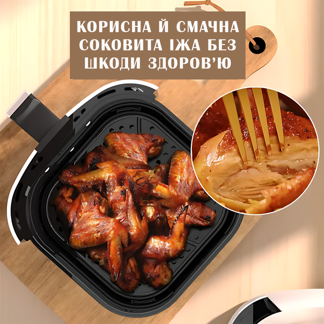- Зручність Використання: Простота в експлуатації — просто помістіть продукти в кошик, встановіть температуру та час приготування, і ви готові до отримання чудових страв;
