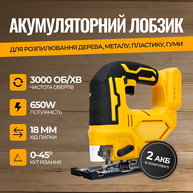 Акумуляторний лобзик 20 V з 2 АКБ, LED-підсвіткою і нахилом до 45°, кейс, жовтий