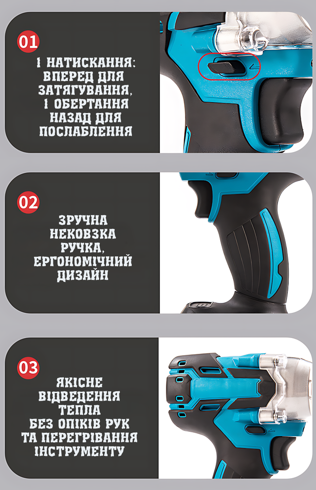 Цей шурупокрут-гайковерт не просто зібрано, щоб щось крутити. Він зроблений для справжньої роботи. Для людей, які не люблять тягати за собою дроти. Для тих, хто хоче ввімкнути — і поїхали!