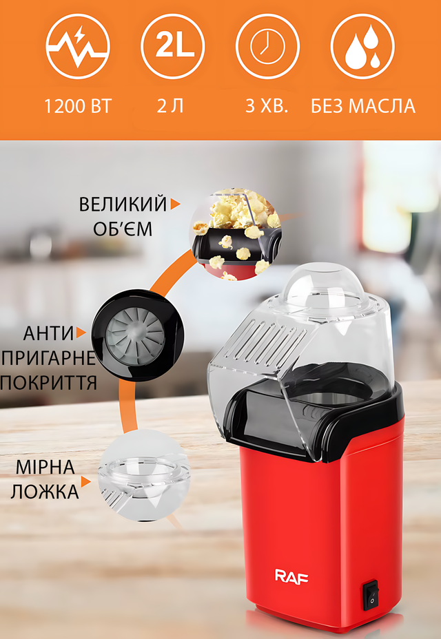 Апарат для приготування попкорну RAF R.9014, безоливна попкорниця 2 л, робота від 220 В