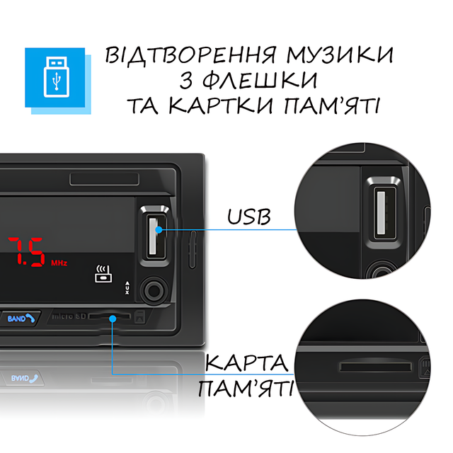 - Широкі можливості відтворення: Автомагнітола підтримує різні джерела звуку, як-от USB-флешки, карти пам'яті, пристрої з Bluetooth і FM-радіо. Це дає вам свободу вибору та можливість слухати улюблену музику в будь-якому форматі, не обмежуючи себе одним типом носія;