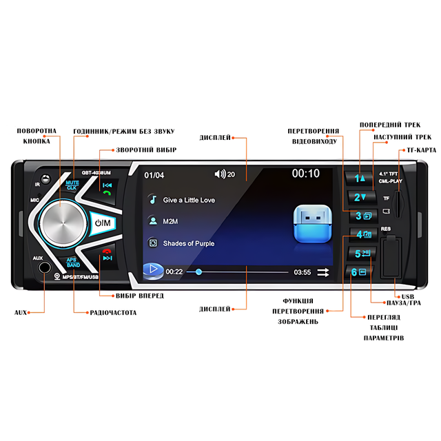 - Інфрачервоний пульт: Керування магнітолою без зайвих рухів. Просто беріть пульт і насолоджуйтеся! Не треба навіть торкатися магнітоле!