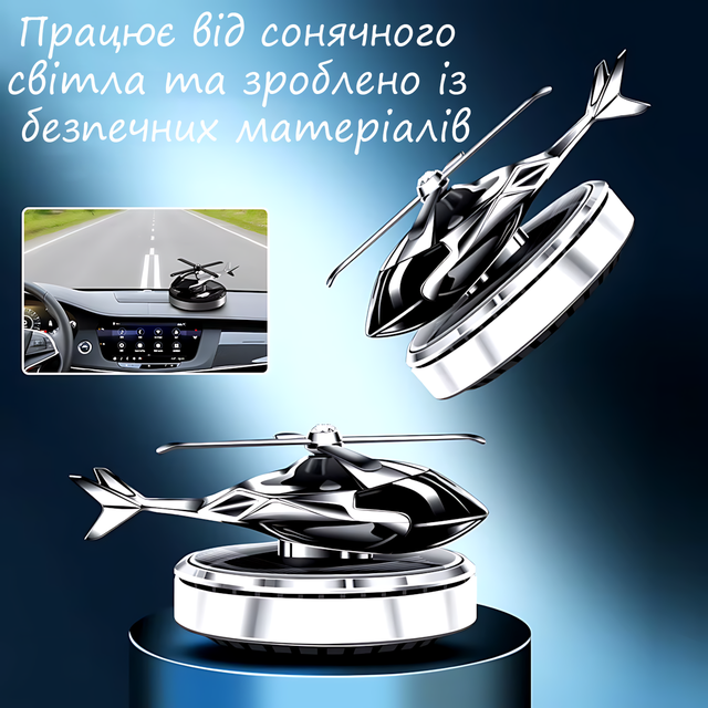 Автомобільний ароматизатор у формі вертольота із сонячною панеллю й багаторазовим просоченням парфумами — це стильний аксесуар, призначений для створення приємного аромату в салоні авто. Завдяки вбудованому вентилятору аромат поширюється рівномірно по всьому салону, що особливо зручно для великих автомобілів або у разі відкритих вікон. Пристрій живиться від сонячної енергії, що робить його незалежним від акумулятора та екологічно безпечним.