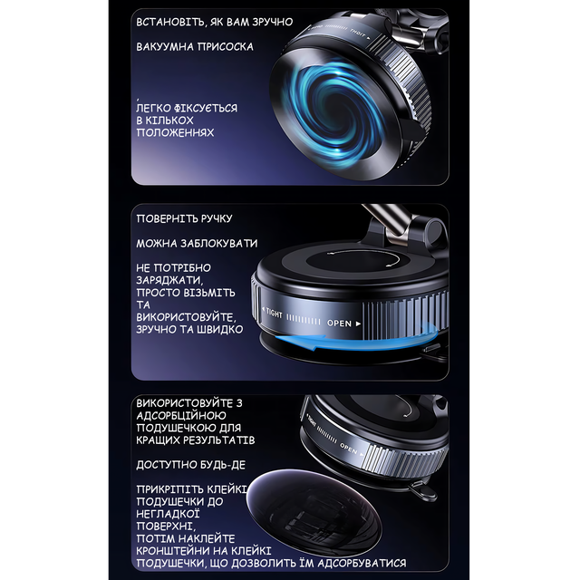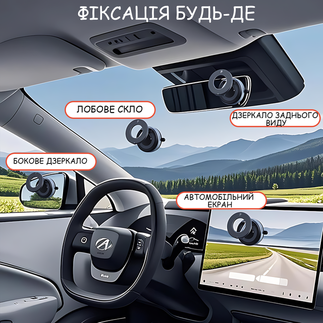 - Поверхні кріплення: скло, дзеркало, плитка, панель авто, стіл;