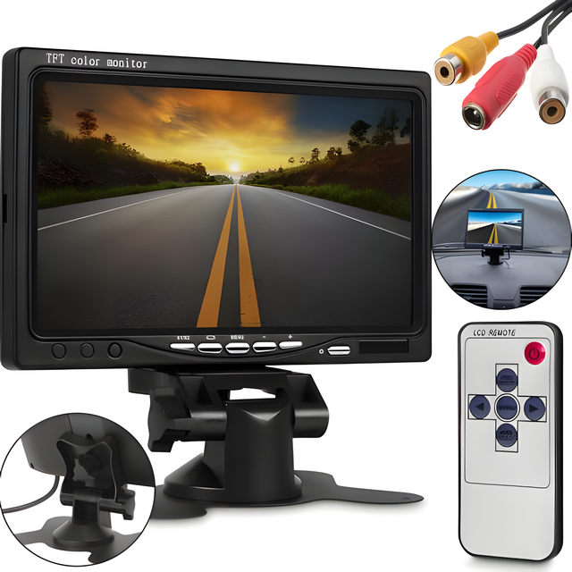 Компактний корпус із міцного пластику та можливість встановлення на торпеду або передню панель автомобіля роблять його ідеальним вибором для будь-якого автомобіля. Керування функціями монітора можна здійснювати як за допомогою кнопок на передній панелі, так і за допомогою ввімкненого пульта дистанційного керування.