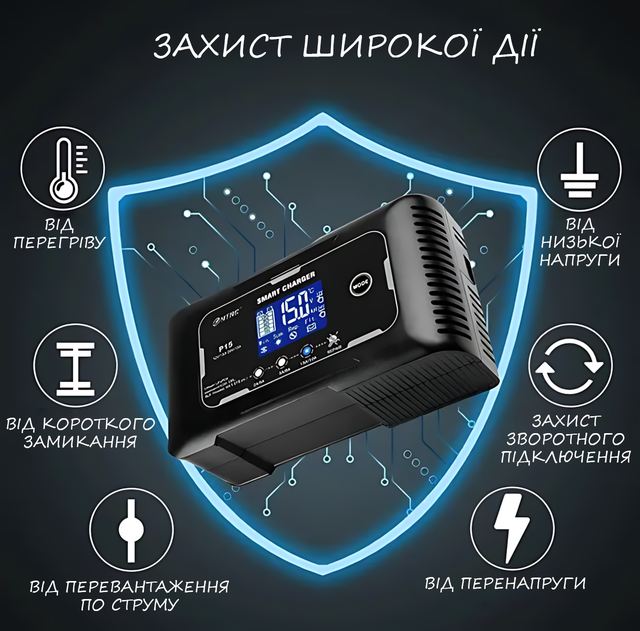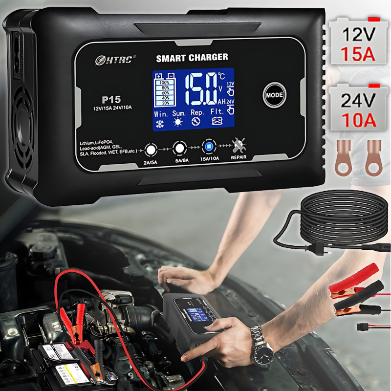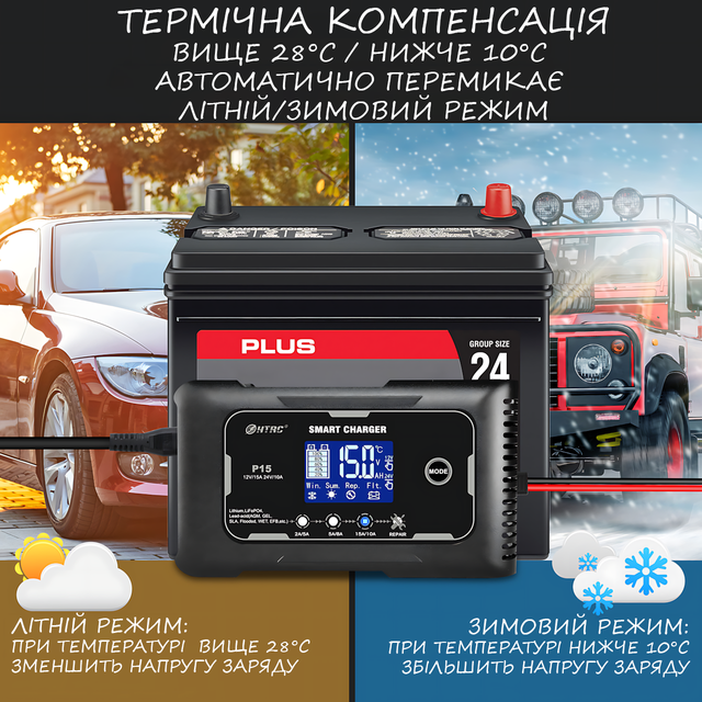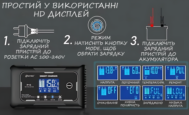 - Зручне використання: Вибір із чотирьох режимів роботи, регулювання струму до 15A, зображення напруги, зарядного струму, температури, рівня заряду, автоматичне перемикання між літнім і зимовим режимами для адаптації до температури довкілля.