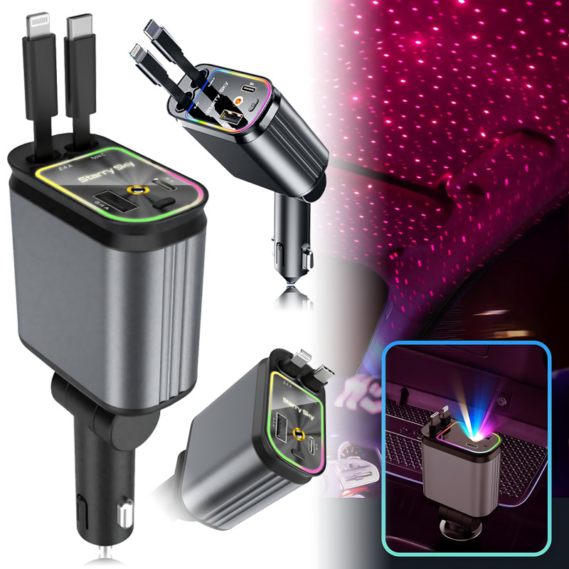 Автомобільний зарядний пристрій Ofottofo ZL-07, 66 Вт, 4-в-1, з висувним кабелем Type-C та iPhone, підсвіткою "Зоряне небо", USB + Type-C, швидке заряджання PD30W + QC3.0, 12–24 В