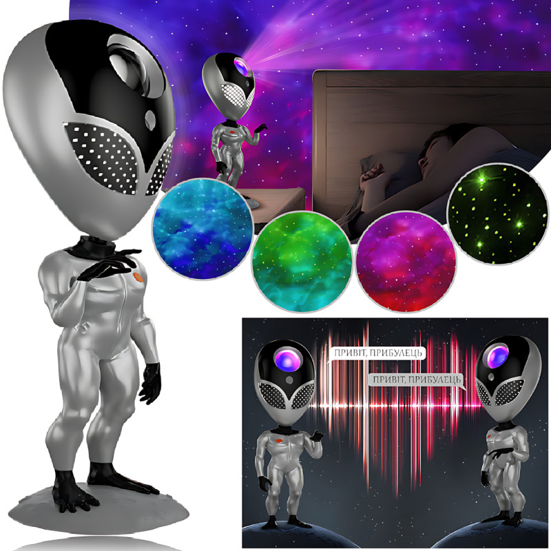STAR PROJECTOR NIGHT LIGHT ALIENSUN — це унікальна лампа-проєктор, яка перенесе вас в атмосферу зоряного неба, створюючи чарівні проєкції туманностей і світлових ефектів. Дизайн у формі інопланетянина з обертовою головою додає пристрою унікальності й інтерактиву. Завдяки компактним розмірам вона ідеально доповнить інтер'єр спальні, вітальні або дитячої кімнати. Лампа обладнана зручним дистанційним керуванням, функцією таймера та численними режимами освітлення, які перетворюють щоночі на чарівне шоу світла.