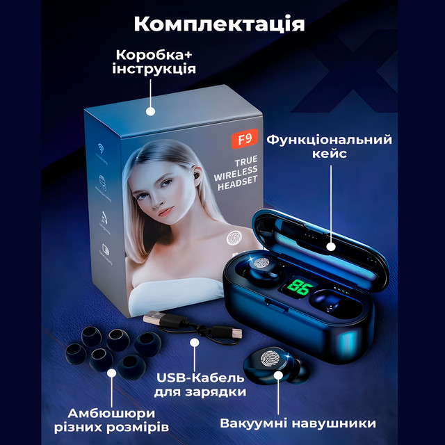 Бездротові навушники Bluetooth F9 TWS WIRELESS, 2000 mAh