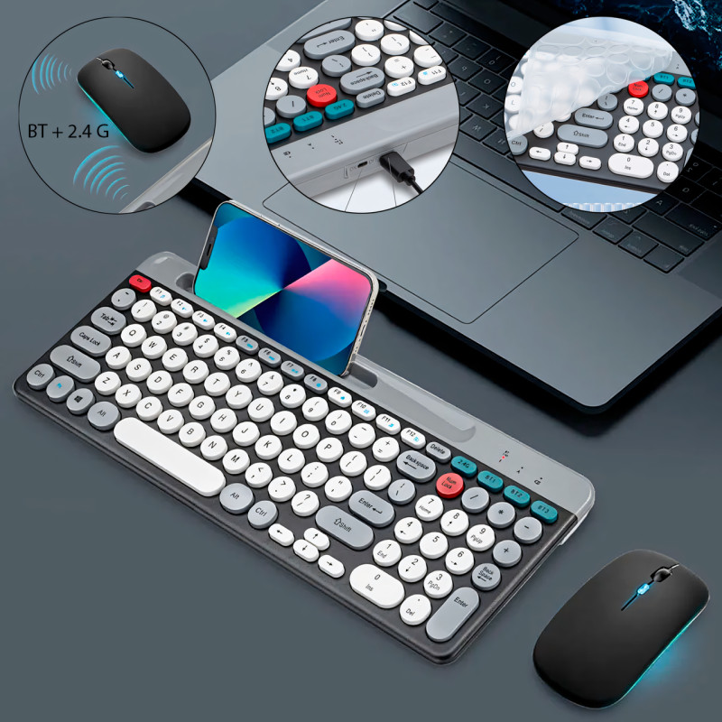 Комплект клавіатури та миші з підтримкою 2,4 ГГц і сумісний з Bluetooth Dual Mode з тримачем для телефона. Бездротова клавіатура та миша. Ергономічна бездротова багатозадачна клавіатура та миша. Підходить для заряджання Mac/iOS/Android/Win7.
