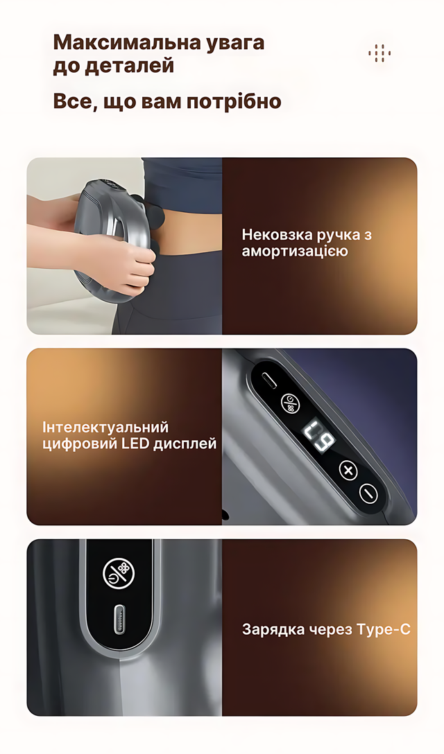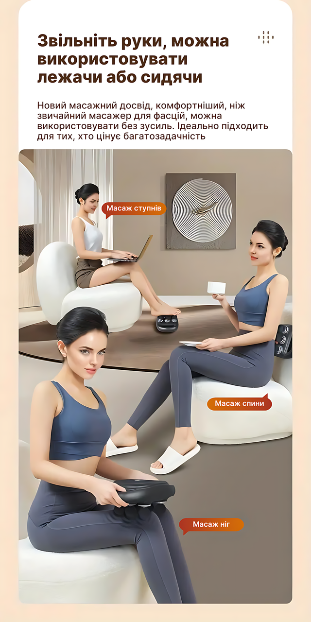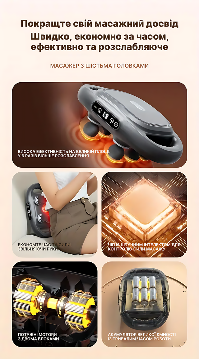 - Глибокий масаж: шість головок вертикально впливають на фасції, досягаючи глибоких м'язів;