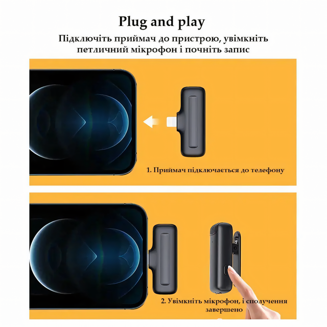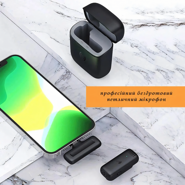 - Простота під'єднання: Бездротовий петельний мікрофон під'єднується автоматично без потреби встановлення програм або використання Bluetooth. Просто під'єднайте приймач до телефона або планшета з портом Type-C;