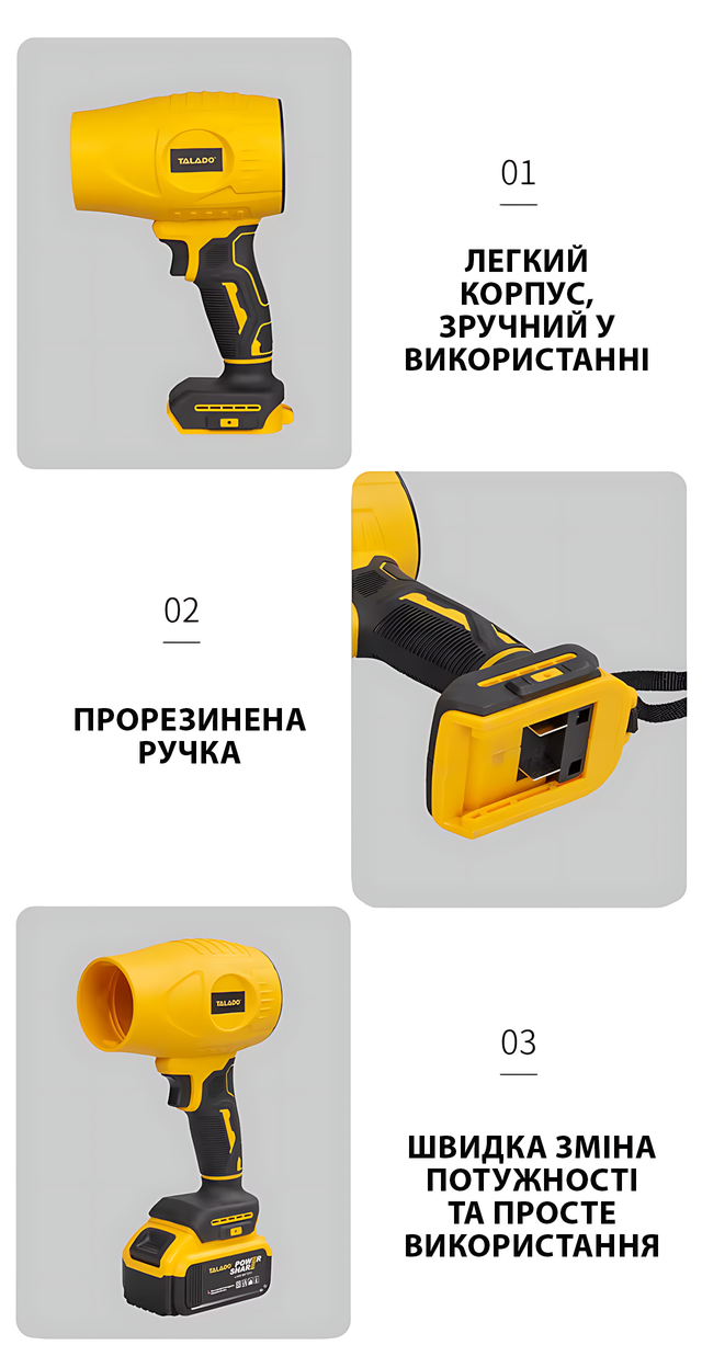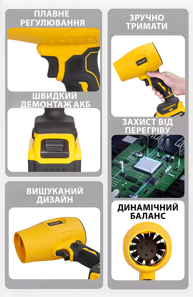 Безщітковий акумуляторний повітродув TALADO ML-B003 21В, 28500 об./хв, 430 CFM, 60 см/с, літієва батарея, 650 г, антиковзна ручка, чорно-жовтий