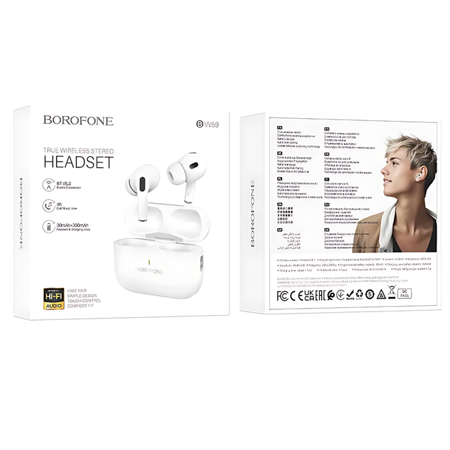 Наушники Borofone BW59 — це поєднання передових технологій, ергономічного дизайну та якісного звучання. Завдяки продуманій конструкції вони комфортно фіксуються у вухах навіть у разі тривалого використання. Легка вага (усього 59 г) і компактні розміри роблять їх зручним аксесуаром для повсякденного використання.
