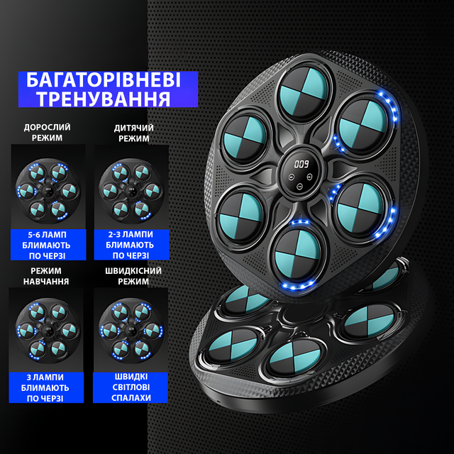 ???? Світлові індикатори підказують, коли та куди бити — відчуй себе героєм аркадної гри, тільки тут головний приз — твоя швидкість і точність! ???? Музичні ефекти розженуть нудьгу та зарядять тебе енергією, а ударостійка конструкція витримає навіть ті моменти, коли ти тренуєшся після особливо напруженого дня.