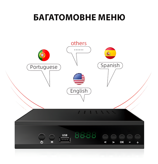 - Додаткові функції: LED-дисплей, PVR, EPG, батьківський контроль;