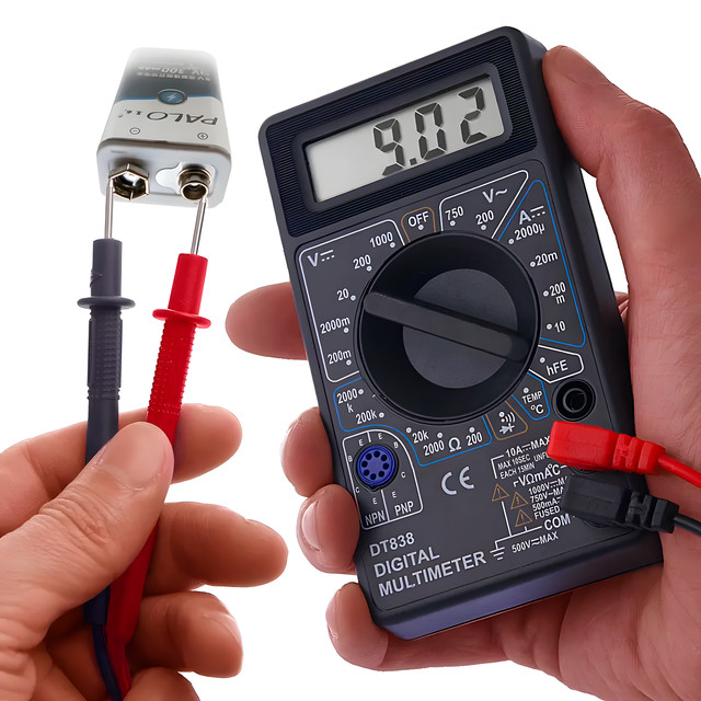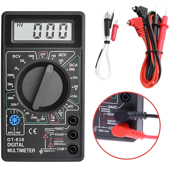 - Багатофункціональність: Мультиметр DT 838 здатний вимірювати різні параметри, включно з напругою, струмом, опором, провідністю та станом індикаторів, що робить його універсальним інструментом для електротехнічних завдань.