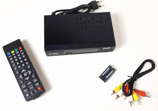 - Комплектація: У комплекті з тюнером йдуть усі необхідні аксесуари для під'єднання та використання: пульт ДК, кабель 3RCA-3RCA, блок живлення 12 V і фірмова коробка.