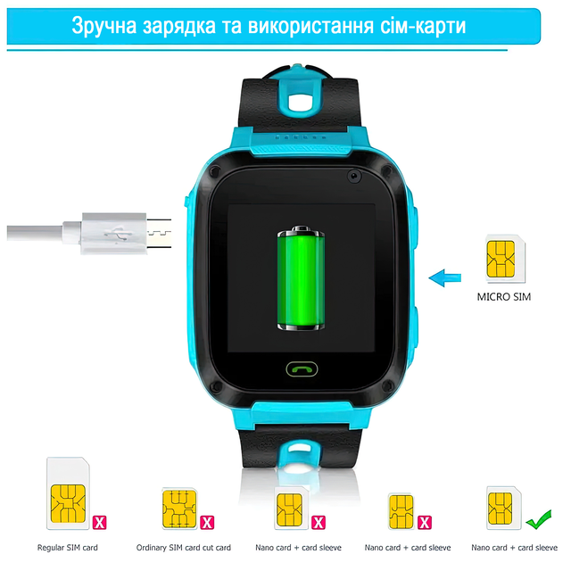 Дитячий розумний сенсорний годинник Smart Watch F2 оснащений кольоровим екраном і може працювати як телефон за допомогою сім карти, підтримує інтернет, дзвінки та повідомлення. Гаджет підключається до телефону за допомогою bluetooth та взаємодіє з ним через спеціальну безкоштовну програму. Годинник виконаний з антиалергенних матеріалів, ремінець - із силікону, який не натирає руку. Головним завданням цього годинника є убезпечити вашу дитину і вони з цим чудово справляються. Функція GPS визначить розташування дитини з точністю до 50 м, кнопка SOS моментально передасть оповіщення на заздалегідь додані номери батьків.