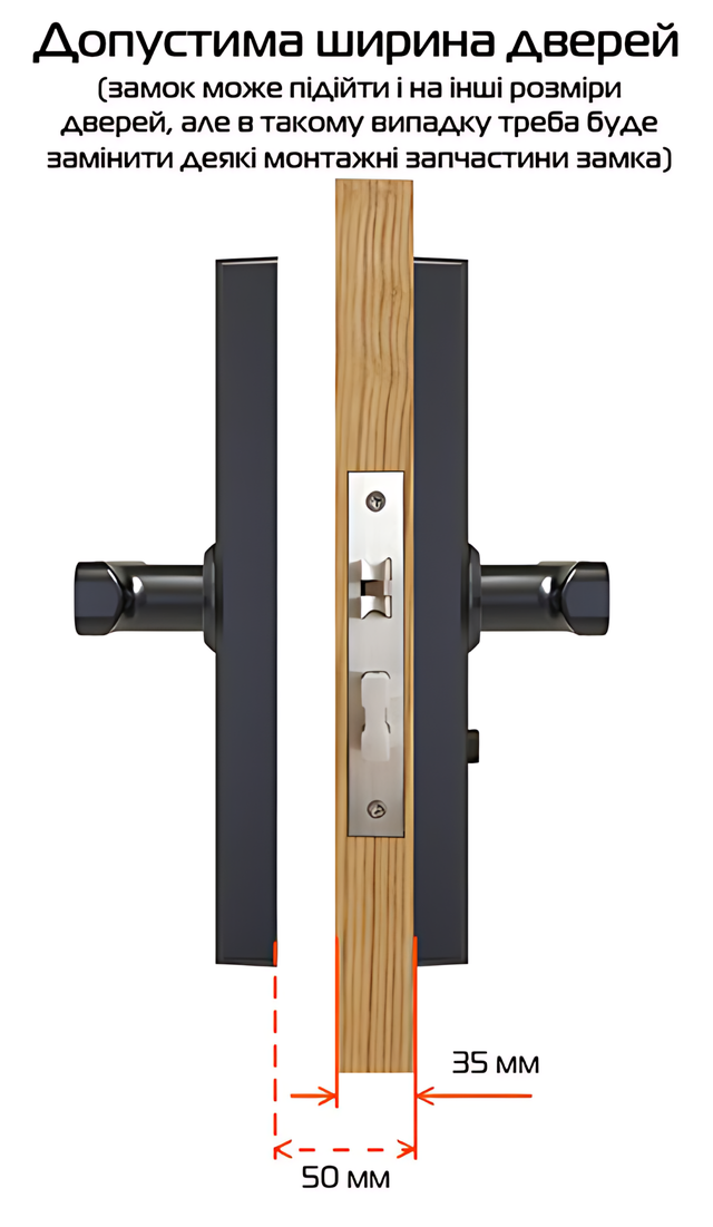 - Допустима товщина дверей: 35-50 мм (можна змінити розмір за допомогою заміни штиря);