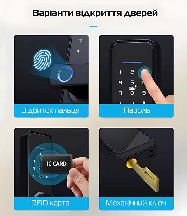- Способи відкриття: паролем, картою, брелоком, браслетом, відбитком пальця, механічним ключем;