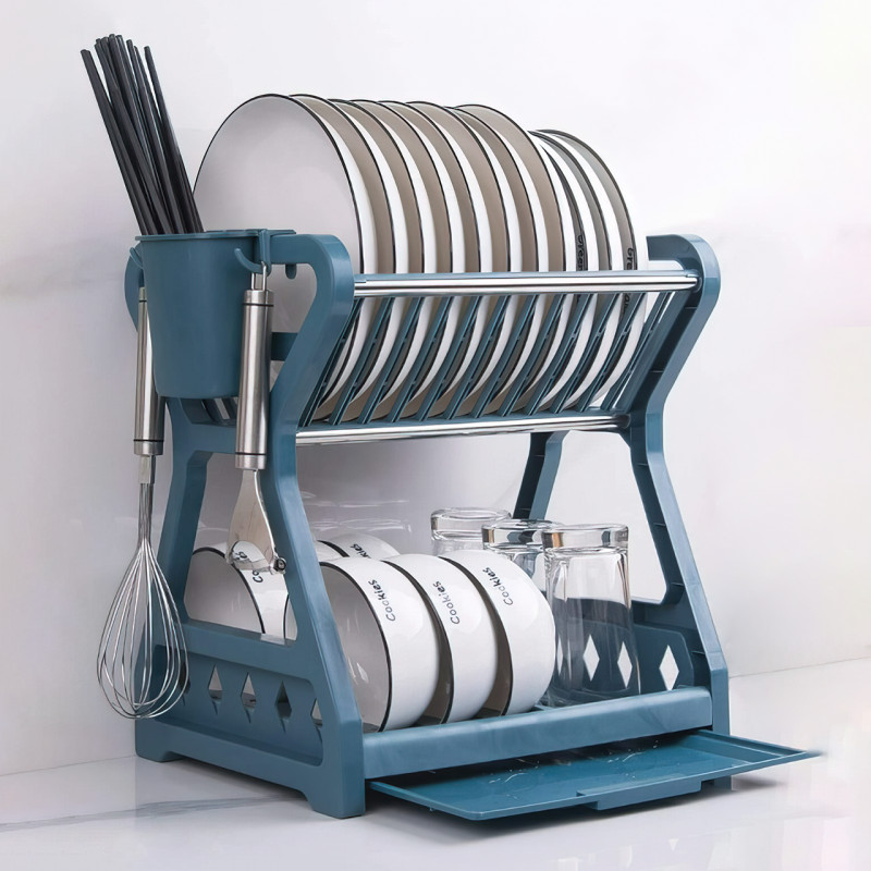 - Зручний дизайн: дворівнева сушарка для посуду має верхній рівень для тарілок діаметром до 22 см, а на нижньому зручно можна розмістити піали та чашки в спеціальних пазах. До комплекту також входять знімна склянка для столового приладдя та гачки для аксесуарів;
