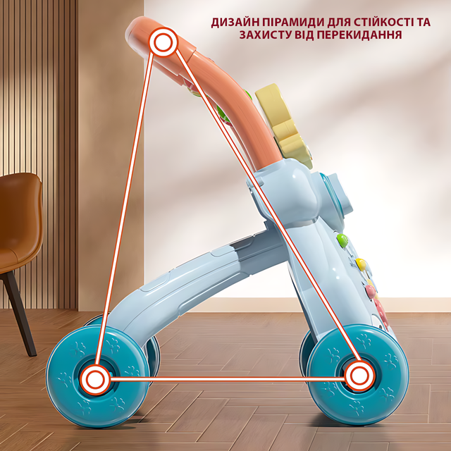 Стійка трикутна структура піраміди з водним баластум забезпечує надійність конструкції та запобігає перекиданню. Гладке кермо з нековзними гумовими вставками, м'які гумові колеса з амортизацією й антиковзним покриттям, а також швидке регулювання коліс — все це робить пересування дитини безпечним і комфортним.