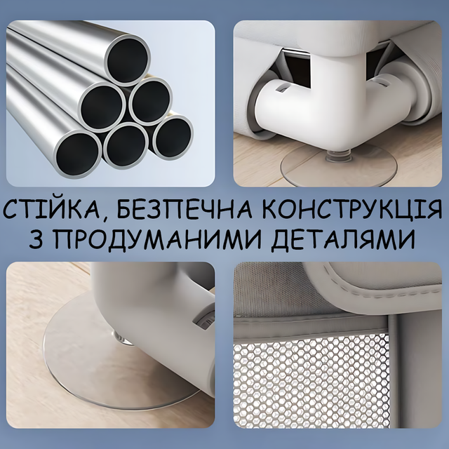- Стійкі ніжки з антиковзними накладками — надійна фіксація без ризику перекидання.
