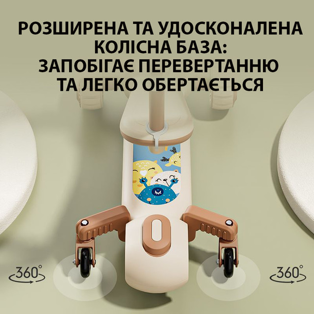 - Безпека: Завдяки своїй міцній конструкції, огорожі та можливості гальмування, цей скутер гарантує безпеку та захист дитини під час руху;