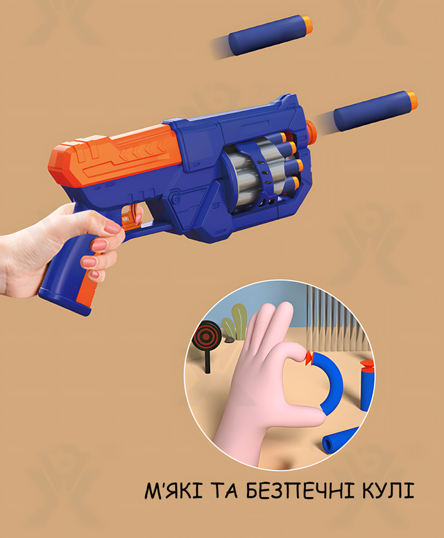 Грати можна як завгодно! Метати безпечні дротики. Закидати м'яч у кошик. Працювати за статичними цілями або влаштовувати домашні турніри — з підрахунком балів, емоціями/криками «попааав!». Світлові та звукові ефекти додають драйву, а безпечний пластик і м'які кулі дають змогу батькам дихати спокійно (ну або майже спокійно — захоплений писк ніхто не відміняв).