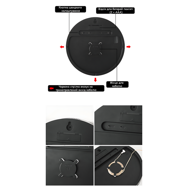Годинник можна повісити на стіну/поставити на стіл. Все продумано. До дрібниць. Керування відбувається за допомогою пульта дистанційного керування/кнопок на корпусі.
