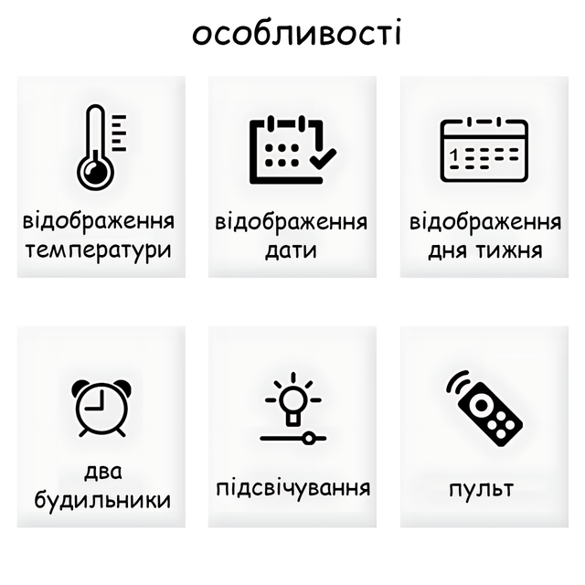 Він відображає не тільки годинник — хвилини. але й дату, день тижня, температуру та вологість (у приміщенні).
