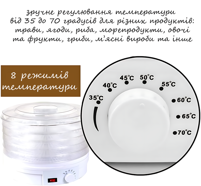 - Температурний діапазон 35-70 °C. Хочеш ніжні в'ялені томати? або міцно висушені яблука для компоту? Вибираєш режим — і... готово!