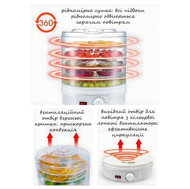 - Вентилятор працює як мініураган, рівномірно розподіляючи тепло. Жодних "пересушених зверху та сирих знизу" фруктів.