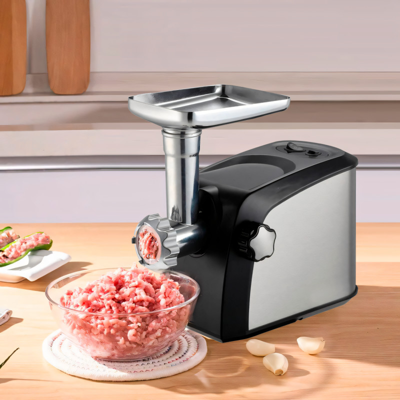 Електрична м'ясорубка обладнана функціями захисту від перегрівання та зворотного ходу. До комплекту входять сітки для подрібнення м'яса та насадка для приготування ковбас. Система двигуна автоматично контролює свою роботу, запобігаючи перевантажуванню та перегріванню, що забезпечує довговічність приладу та знижує ризик зламання.