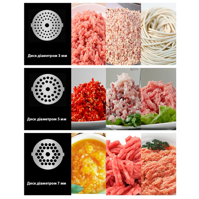 - 3 сталевих диски для подрібнення продуктів діаметром 3 мм, 5 мм, 7 мм;