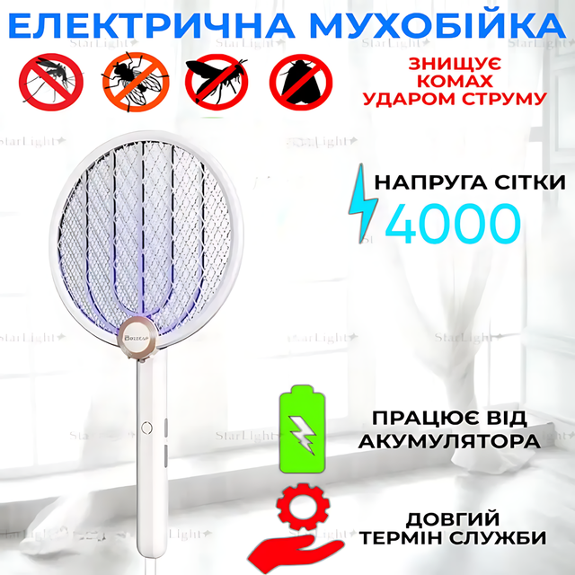 Ця електрична ракетка-ловушка з ультрафіолетом і акумулятором 1200 мА·год діє як мисливець, дозорний і охоронець твого простору — вдома, на дачі або в поході.