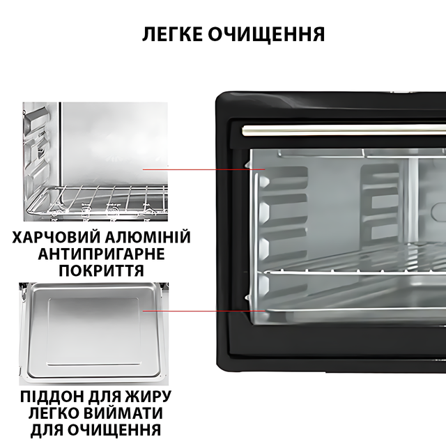 - Просте механічне керування — ви не зобов'язані бути технологічним генієм, щоб із ним впоратися. Повернули ручку — і піч готова працювати. Жодних складних налаштувань або кнопок — просто увімкніть і готуйте!