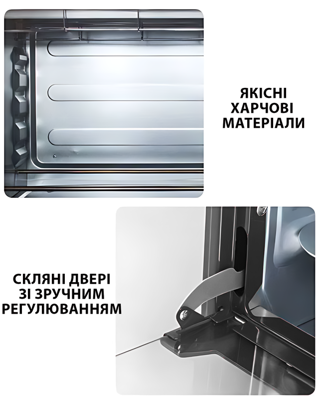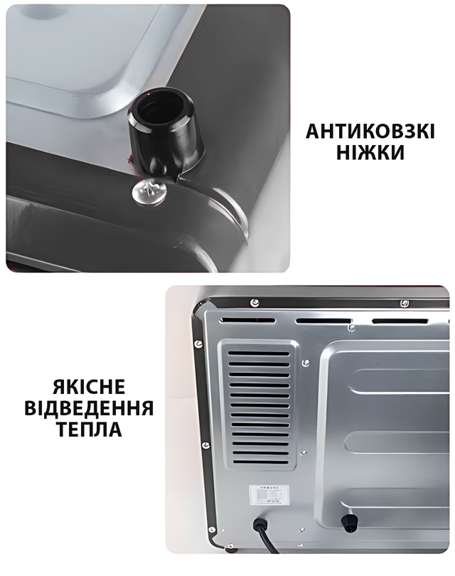 - Компактні розміри та стильний чорний корпус — піч не тільки робить вашу кухню функціональнішою, але й додає яскравості та затишку.