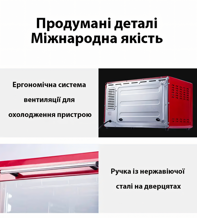 - Настроювання: Налаштування таймера до 60 хвилин і температури в діапазоні 60–230°C, дадуть змогу підібрати оптимальний режим приготування для різних страв.
