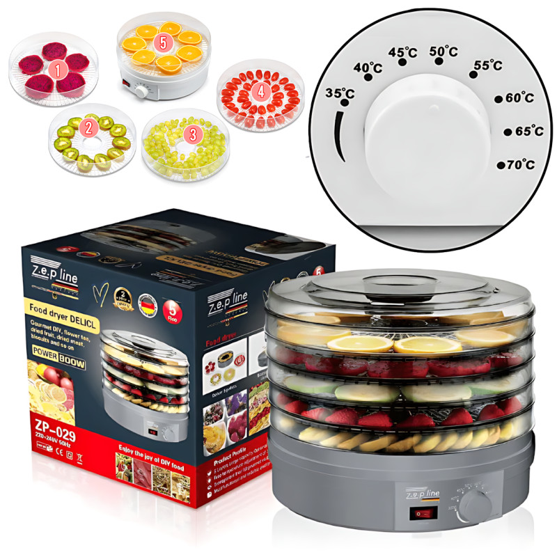 Уявіть собі: літній смак ягід і аромат свіжих трав будь-якої пори року! Сушилка Zepline ZP-029 — ваш ключ до збереження користі та яскравого смаку продуктів. Потужність 500 Вт і п'ять містких ярусів перетворять звичайні фрукти, овочі, гриби та м'ясо на справжні делікатеси. Хочете зробити пащі або домашні закуски? Легко! Прозора кришка дає змогу стежити за процесом сушіння без зайвого клопоту.