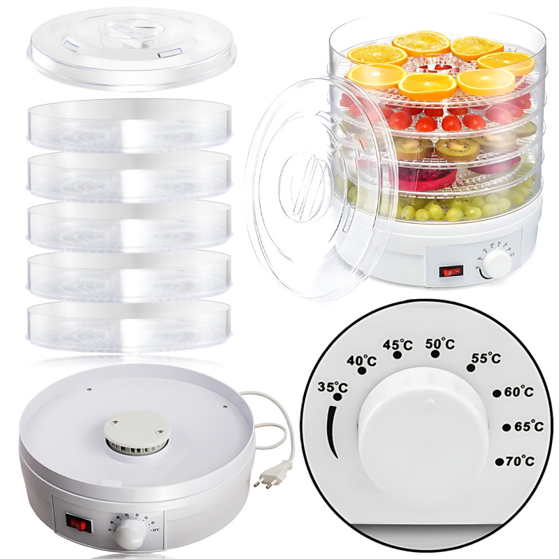 - ???? П'ять ярусів місткістю до 5 кг: Зручне розміщення й економія часу — сушіть відразу багато продуктів за один цикл!