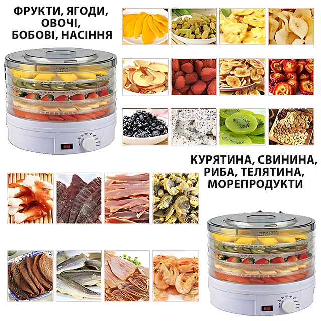 - ???? Багатофункціональність: Фрукти, овочі, гриби, зелень, м'ясо, риба, горіхи та навіть домашні печива — сушіть усе, що завгодно!