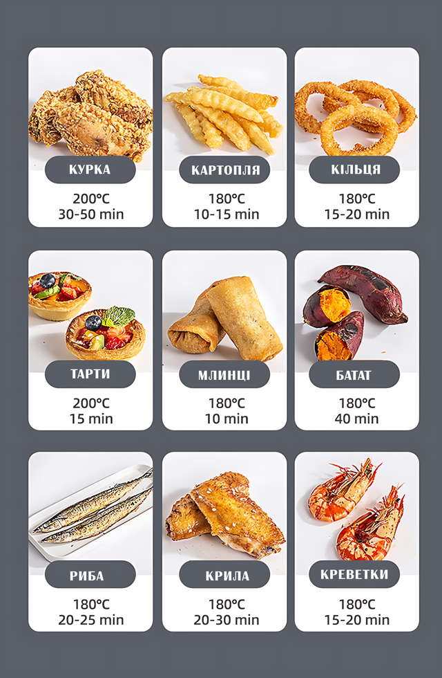 - ✅ 8 програм приготування — смаження, випікання, гриль, розморожування, зневоднення, підігрівання та режим Keep Warm.
