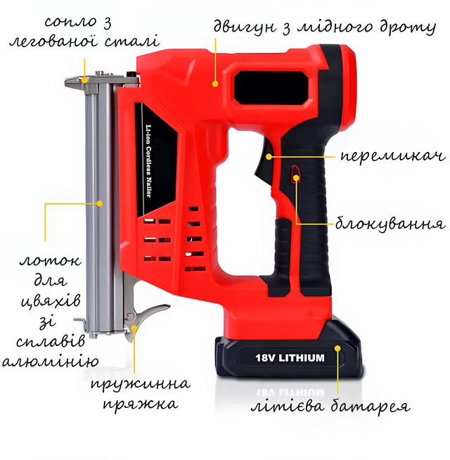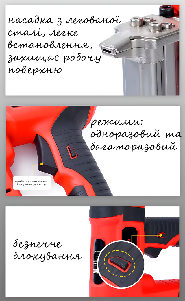 - ⚡ Швидкість вогню — цвяхи до 30 мм йдуть один за іншим.